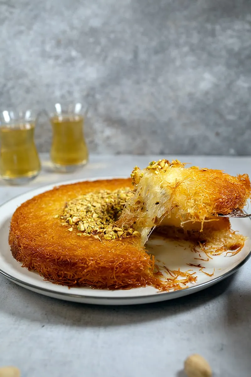 Ce dessert très connu est servi chaud, parfois accompagné d’une boule de glace. Les filaments de pâte, cuits au four, deviennent encore plus savoureux lorsqu'ils sont imbibés de sirop. Grâce à ce sirop, le künefe rappelle un peu la célèbre baklava.